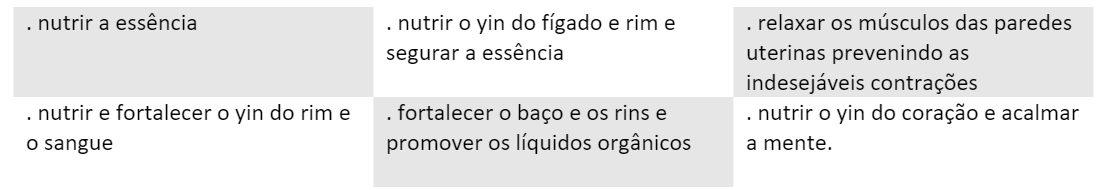 O relaxamento do útero é também extremamente importante para prevenir as contrações uterinas que poderão causar hemorragias e possível aborto. Nesta fase é sobretudo importante reforçar o rim, base da essência. Consoante seja mais preponderante uma situação de vazio de yang ou de vazio de yin do rim assim podemos utilizar: